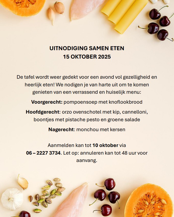 Elke vierde woensdag van de maand wordt er een etentje georganiseerd door Noaberschap. De kosten hiervoor zijn €10,00 en voor kinderen wordt een bijdrage van €6,50 gevraagd. Kosten voor consumpties zijn voor eigen rekening.